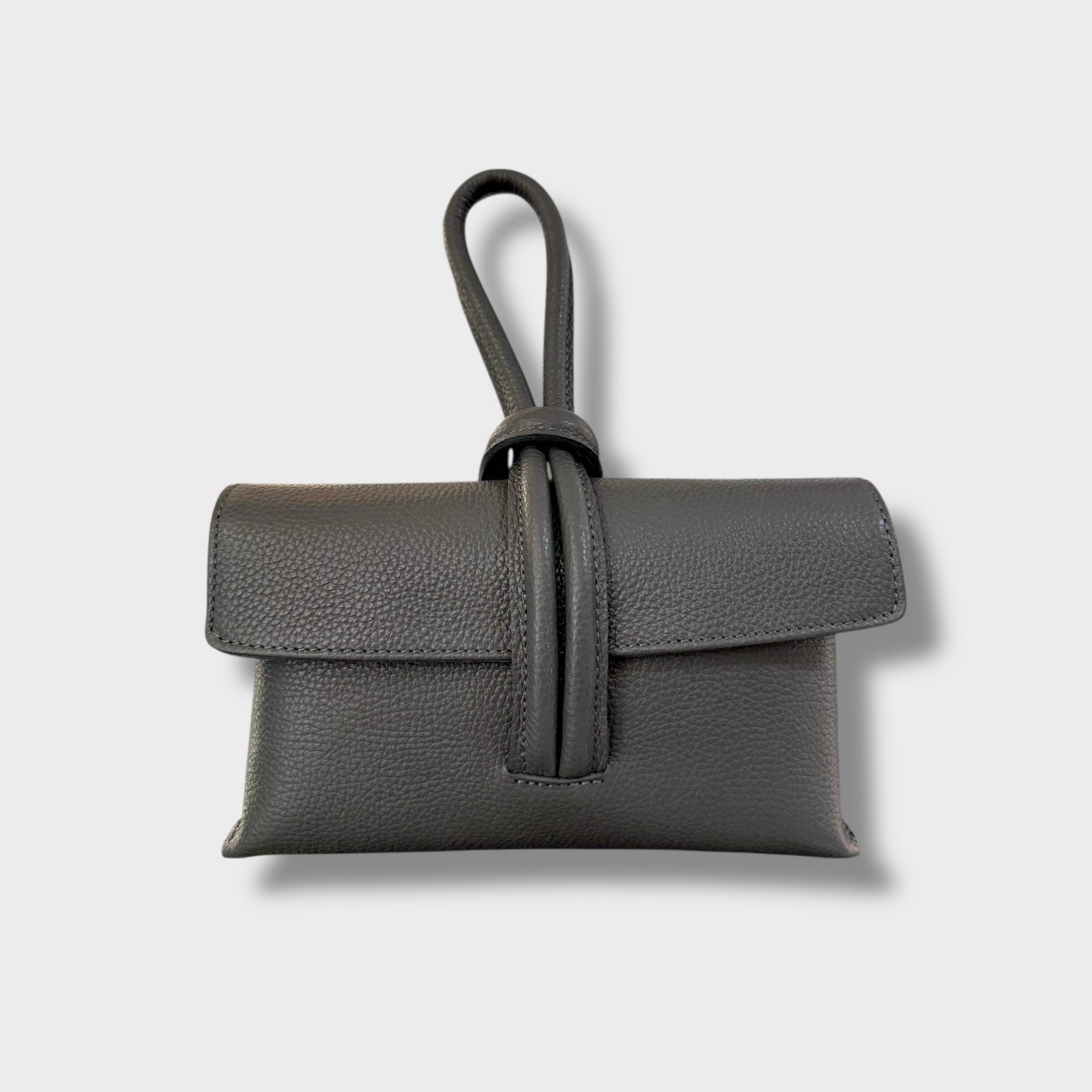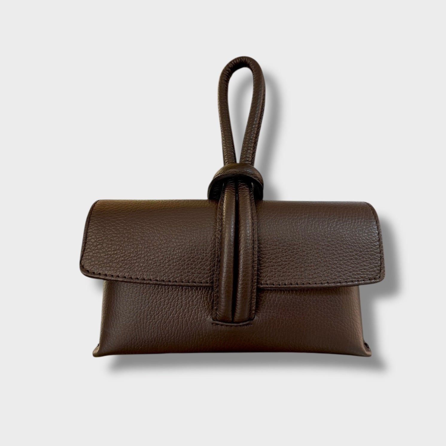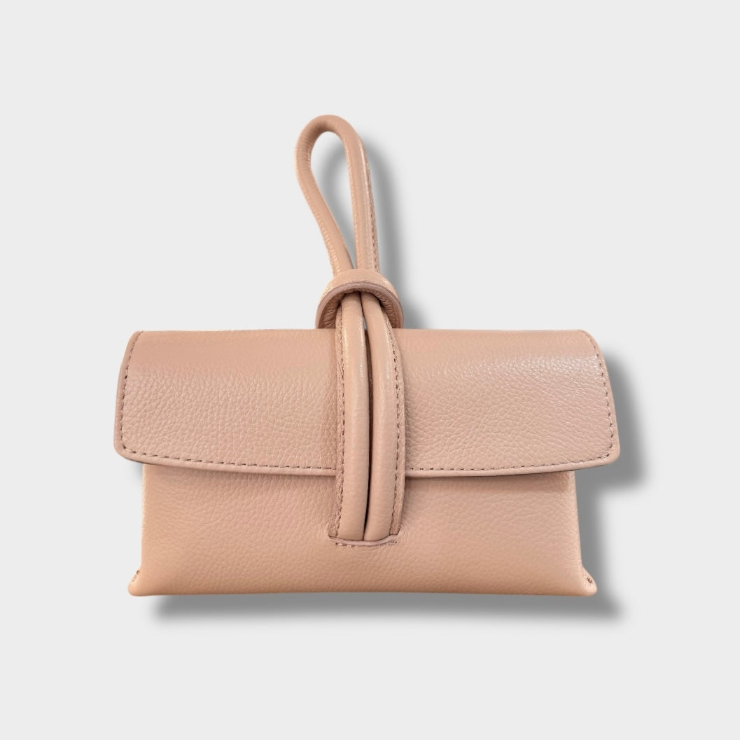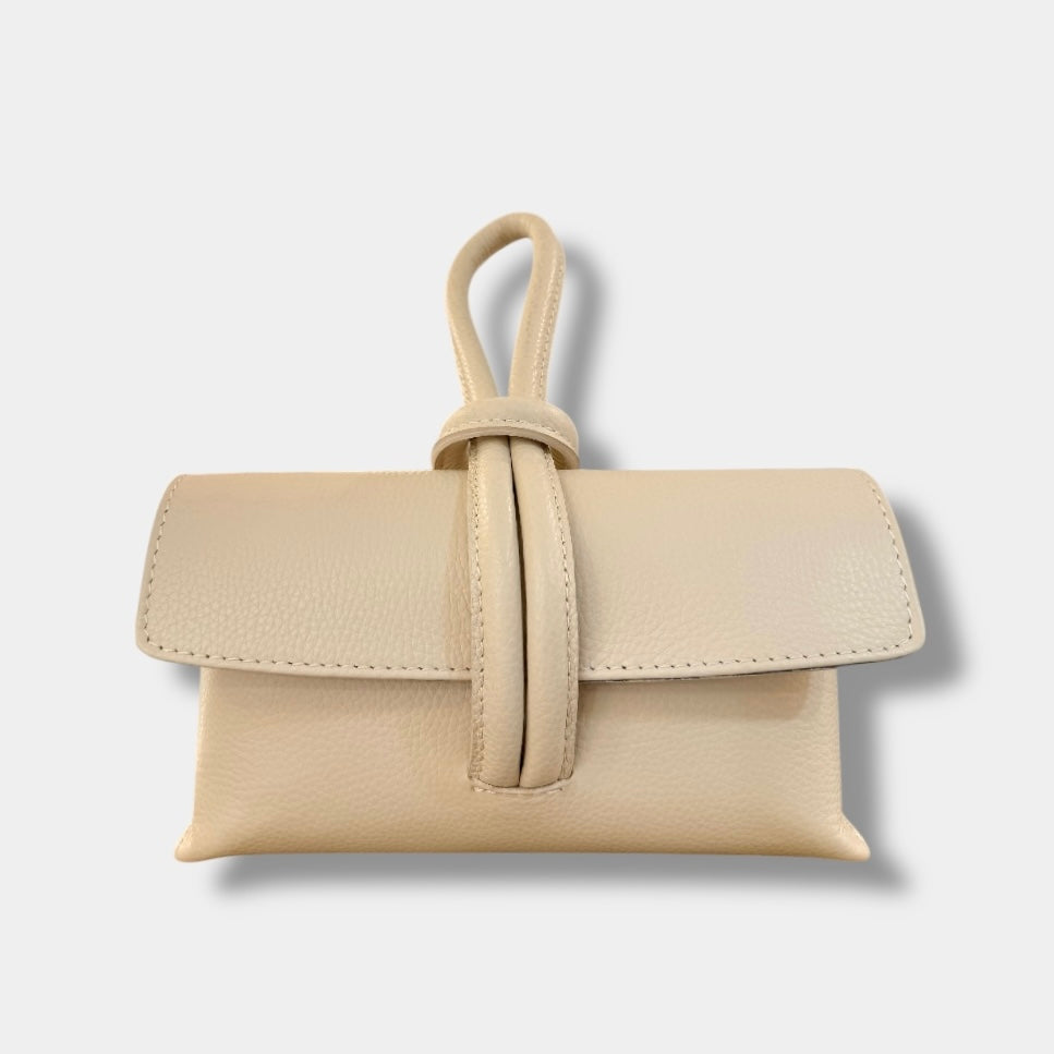 E’ particolare e dallo stile moderno questa pochette a mano, con chiusura a nodo. E’ completa di tracolla regolabile.