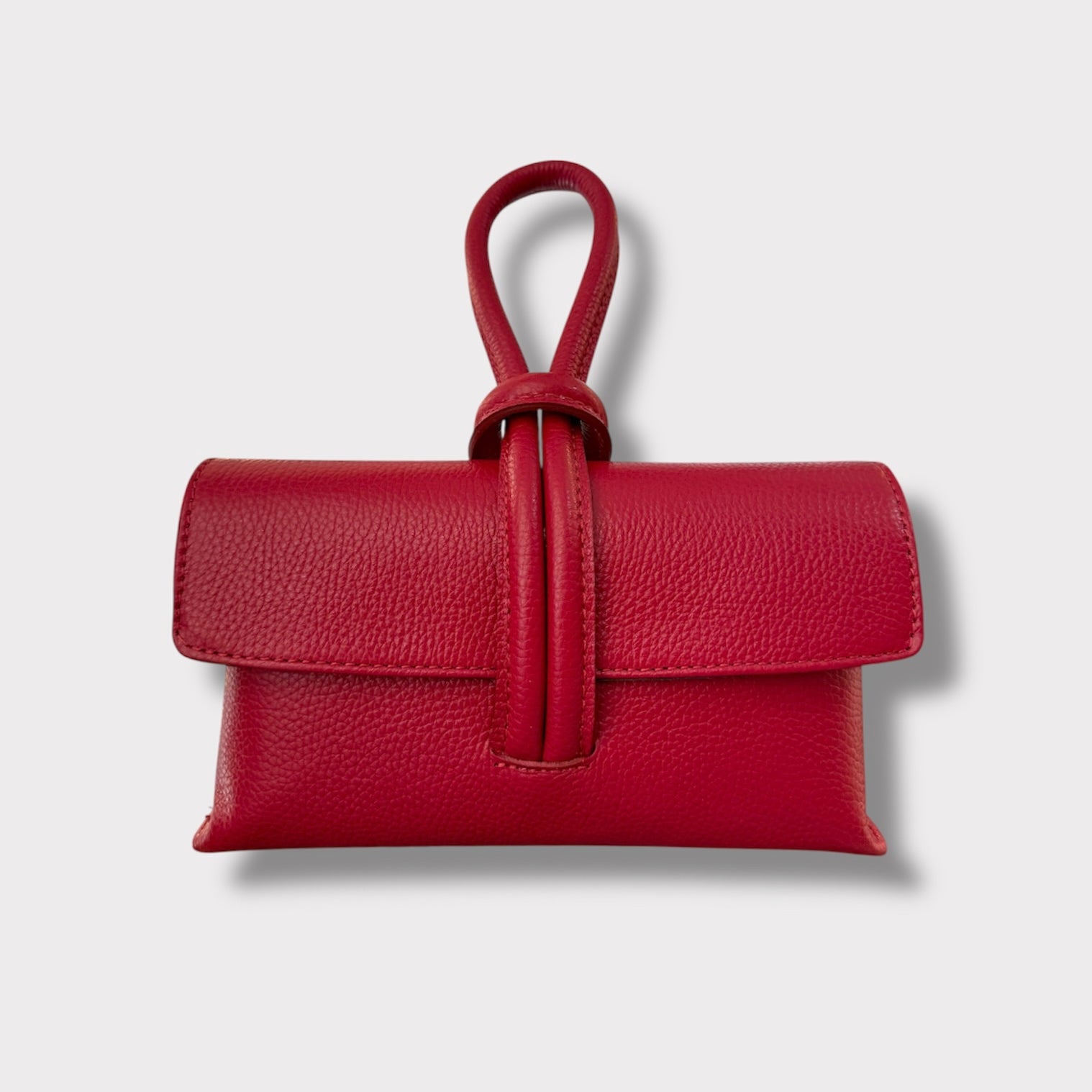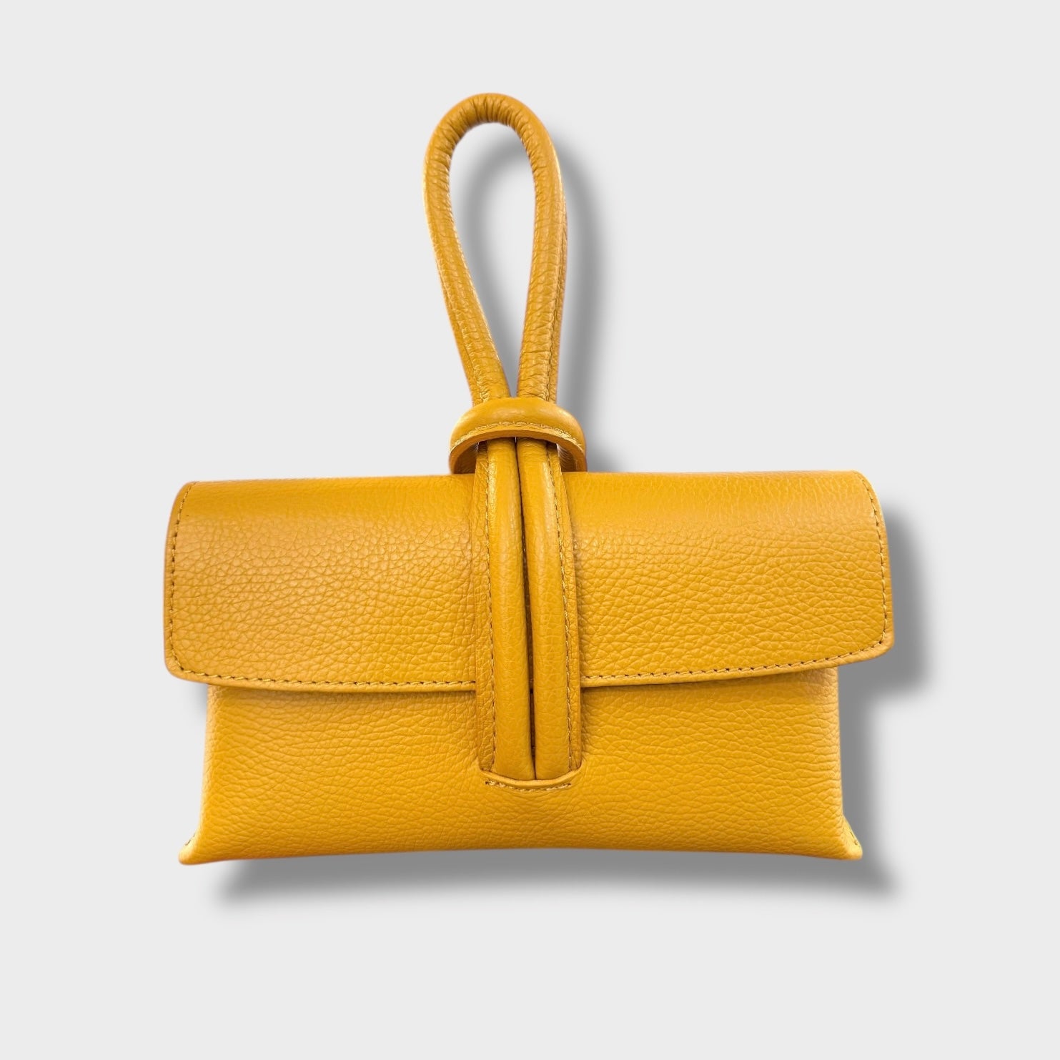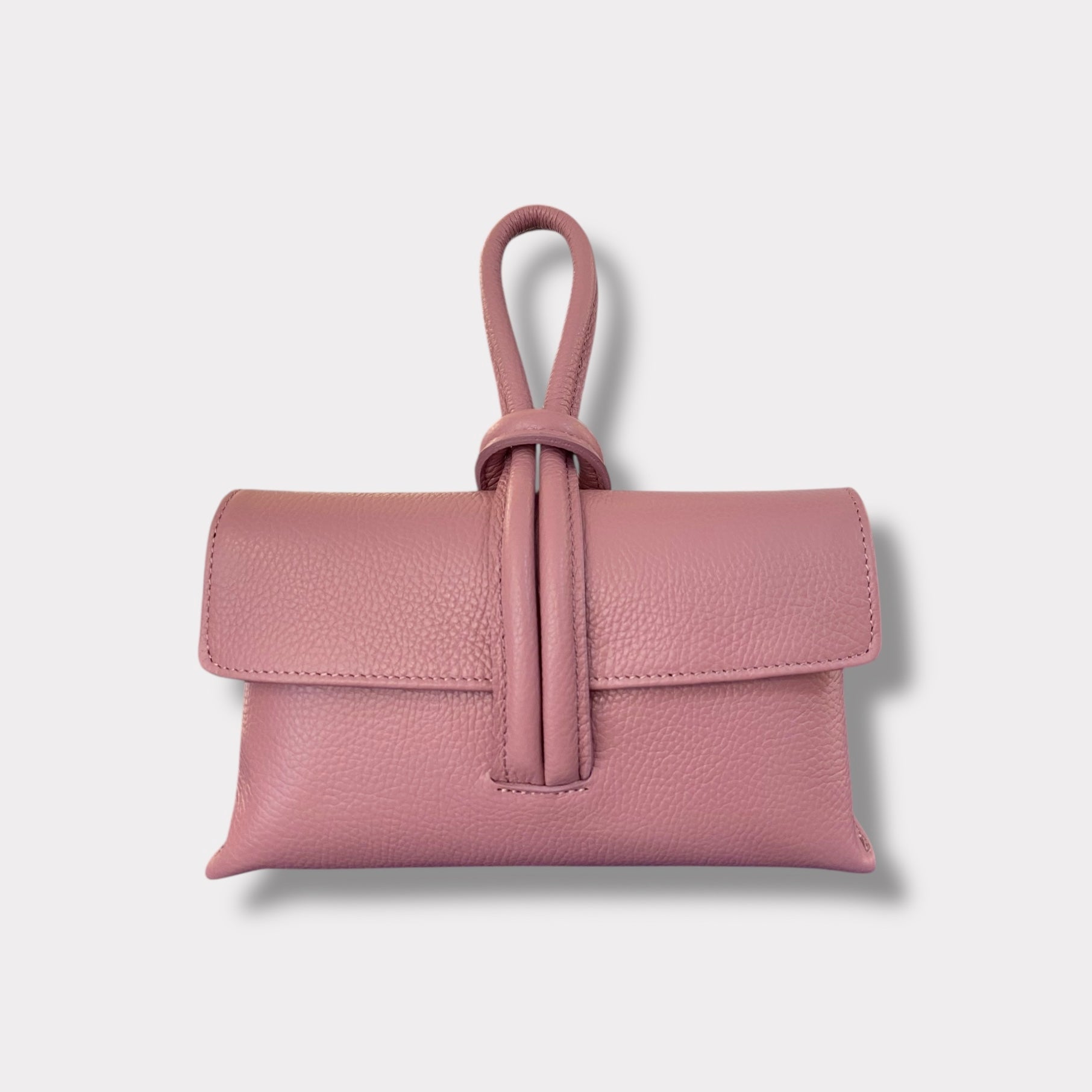 E’ particolare e dallo stile moderno questa pochette a mano, con chiusura a nodo. E’ completa di tracolla regolabile.