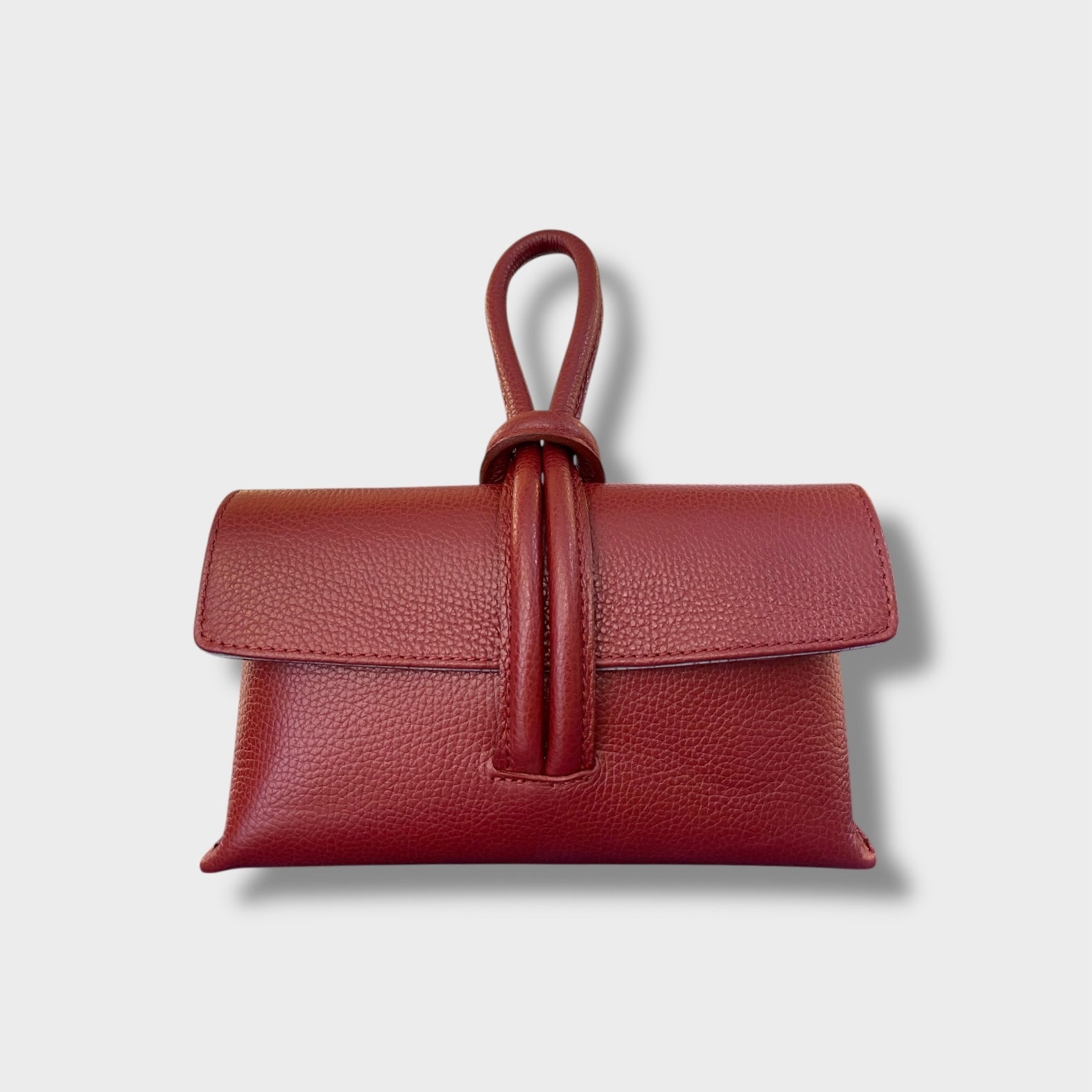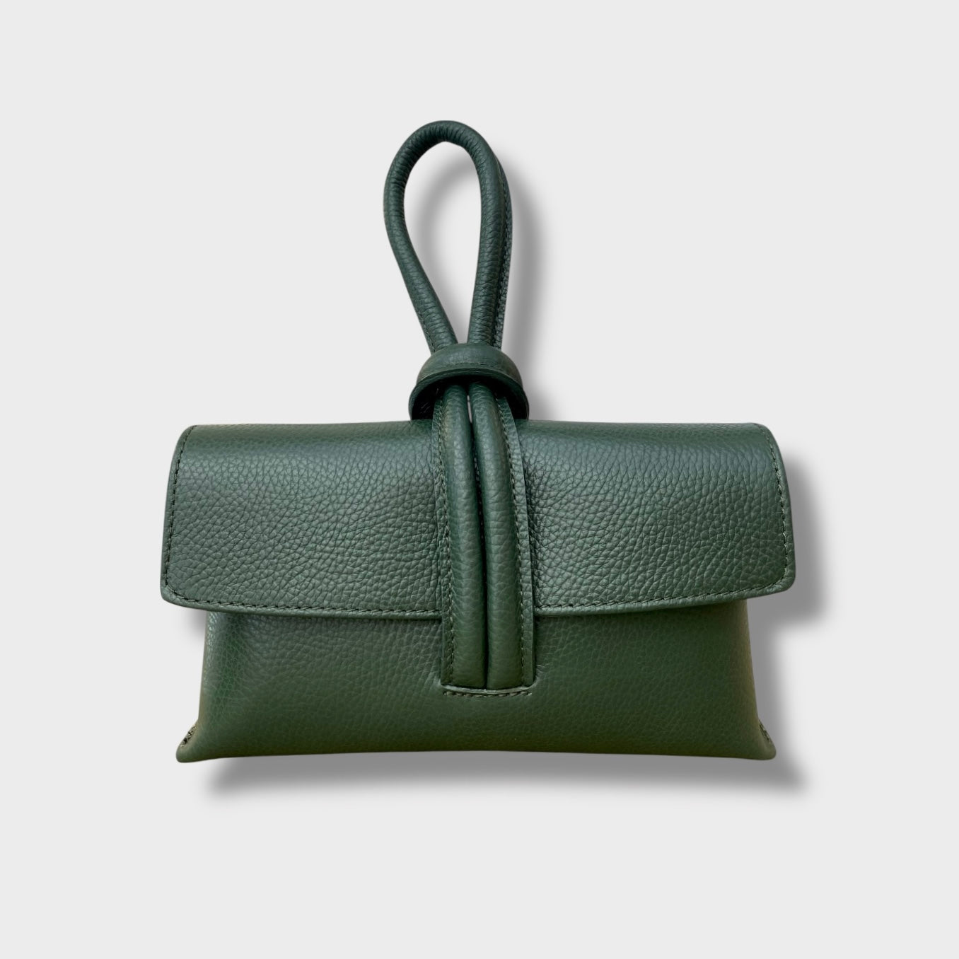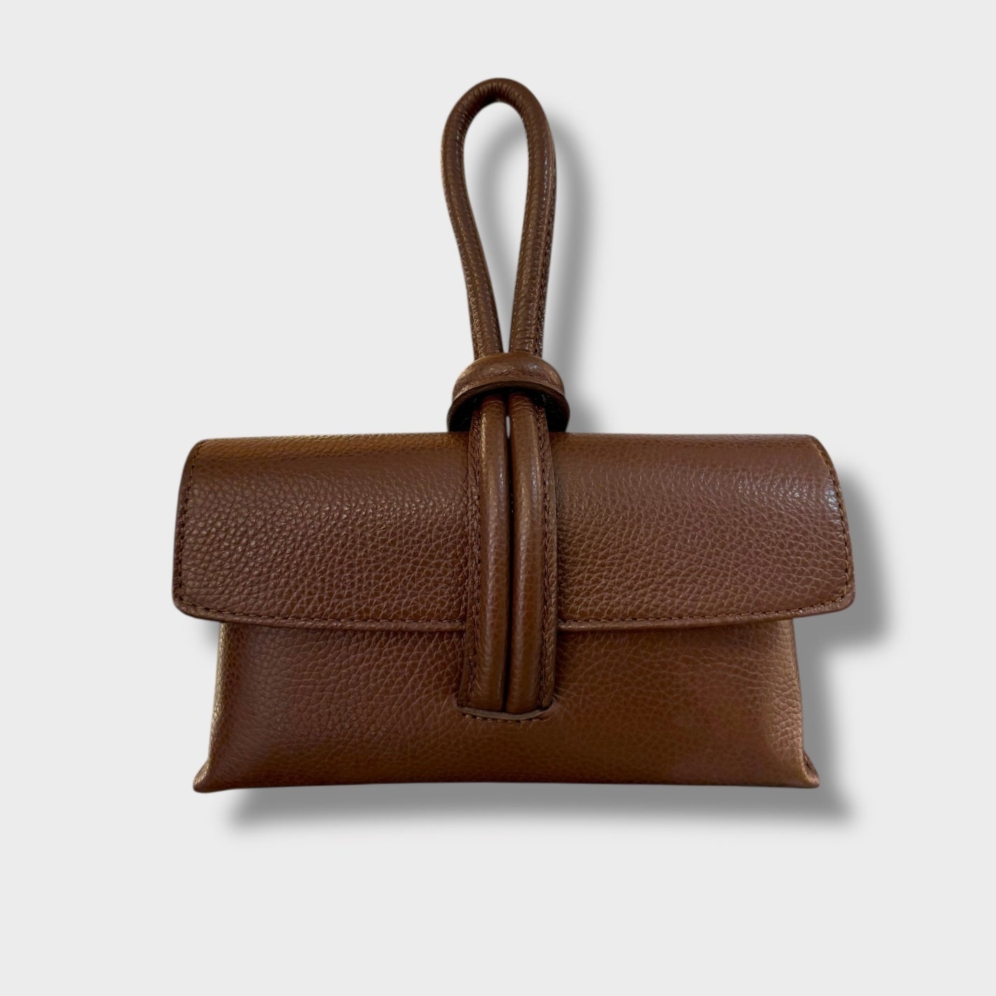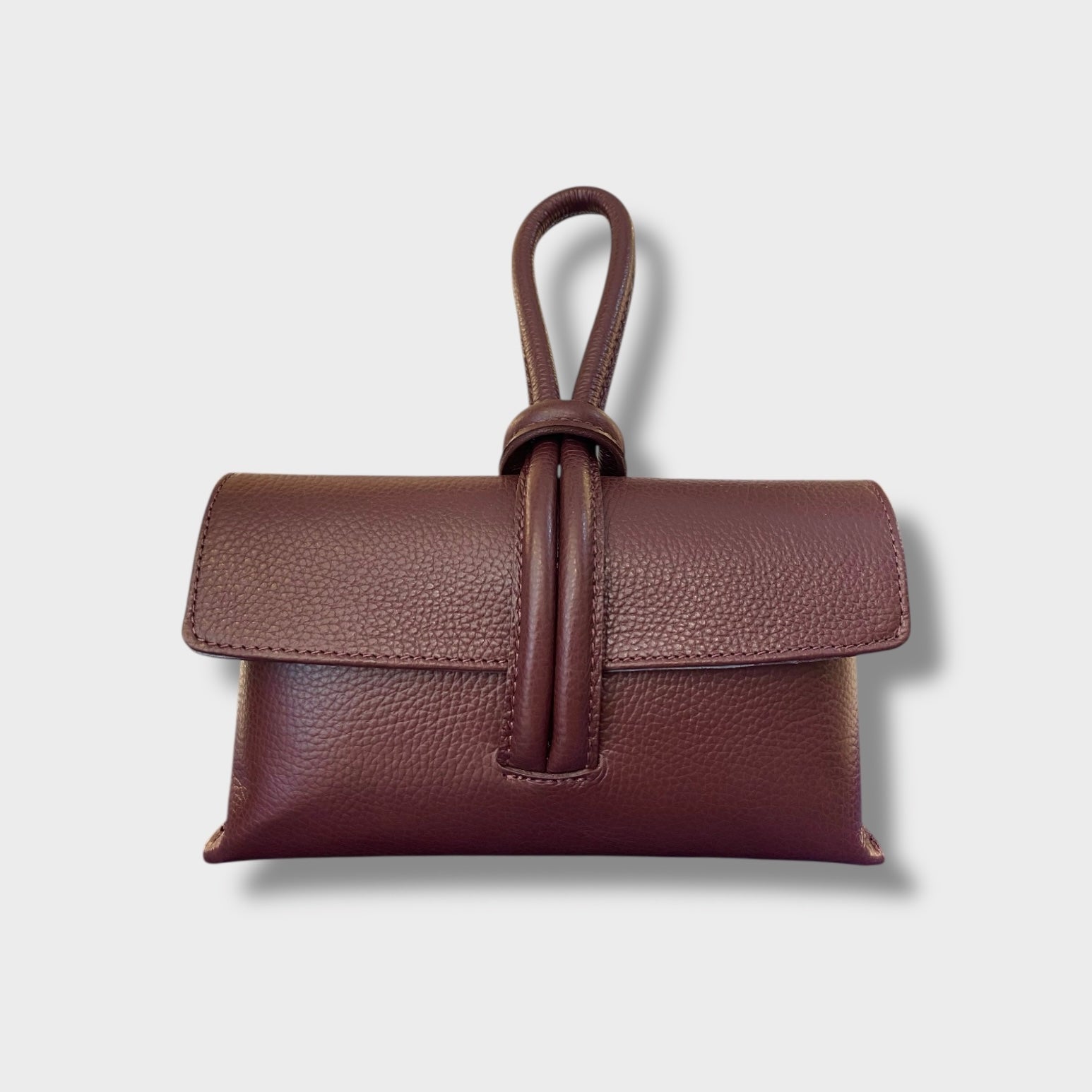 E’ particolare e dallo stile moderno questa pochette a mano, con chiusura a nodo. E’ completa di tracolla regolabile.