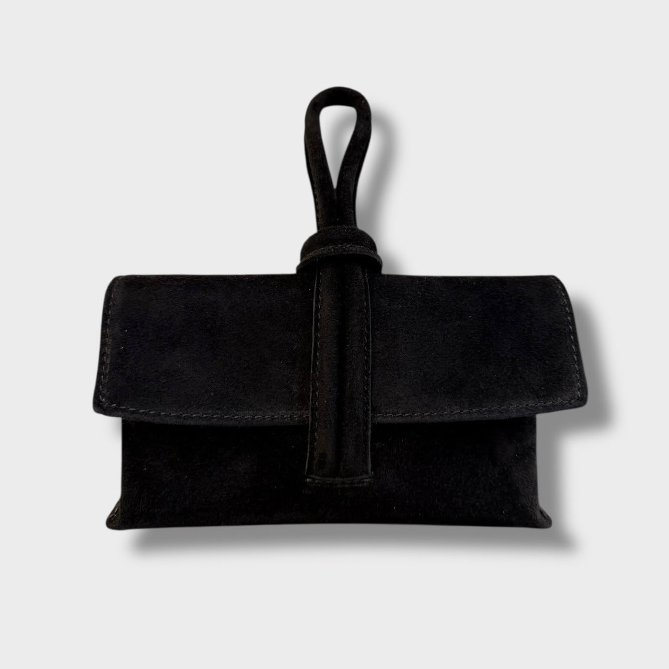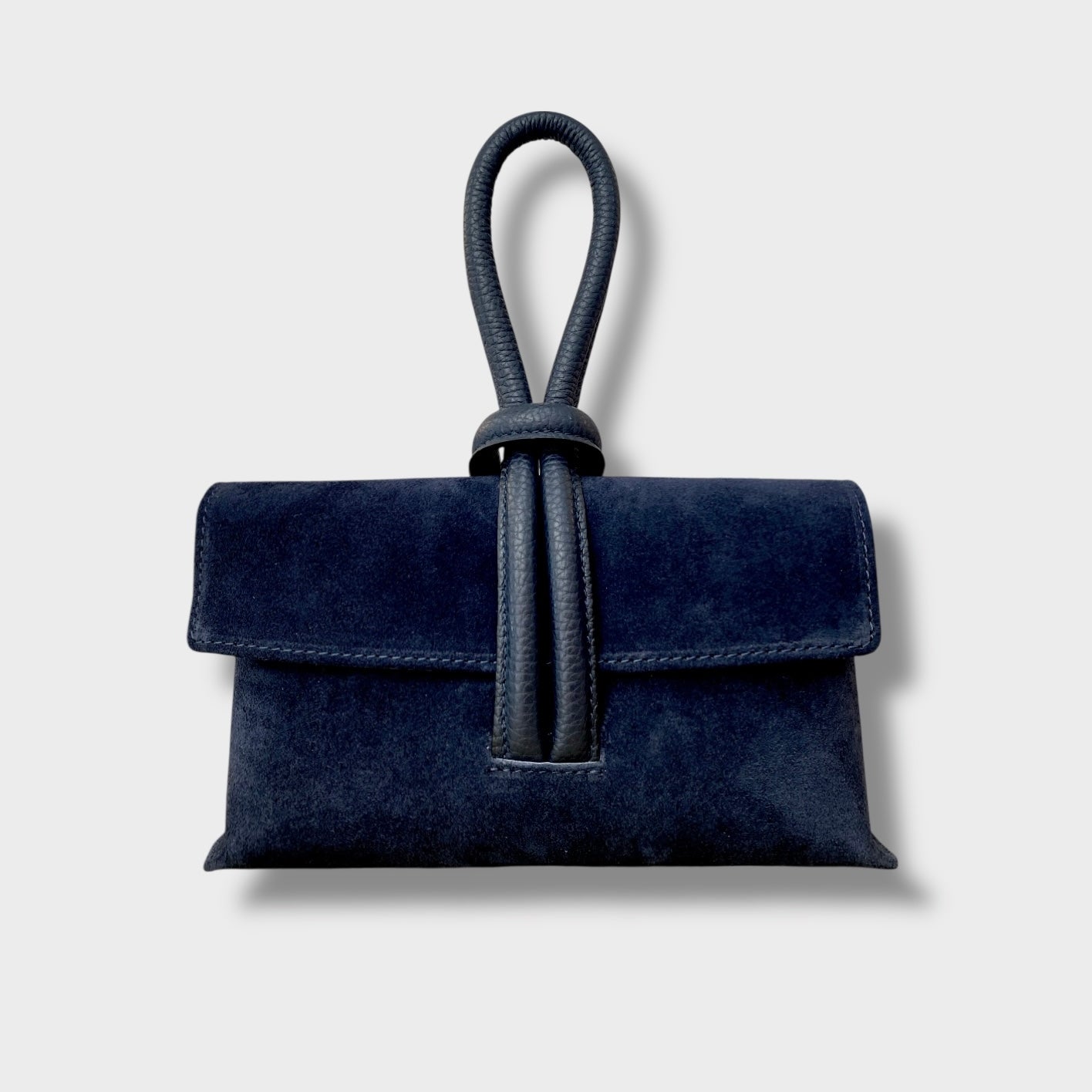 E’ particolare e dallo stile moderno questa pochette a mano, con chiusura a nodo. E’ completa di tracolla regolabile.