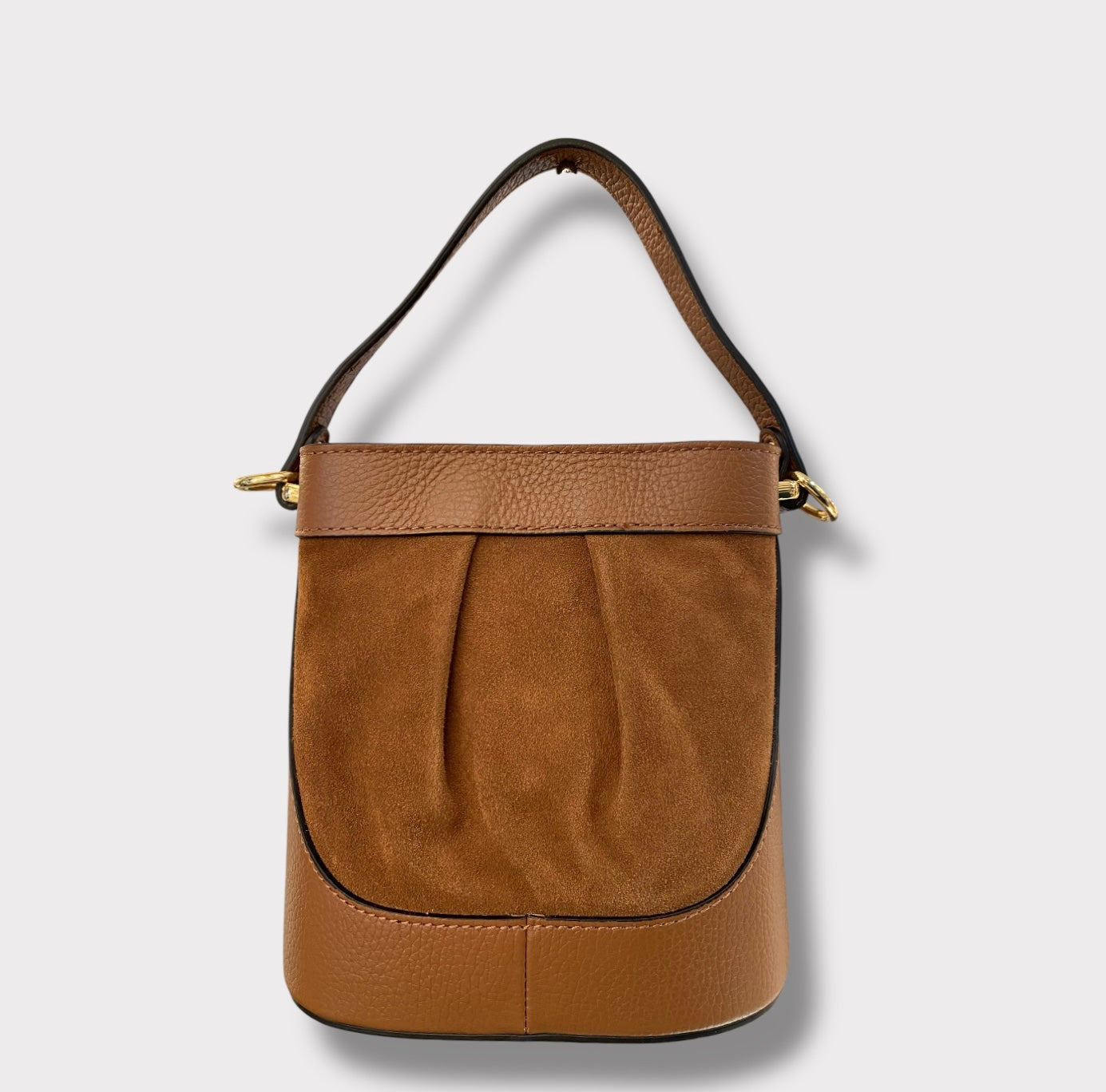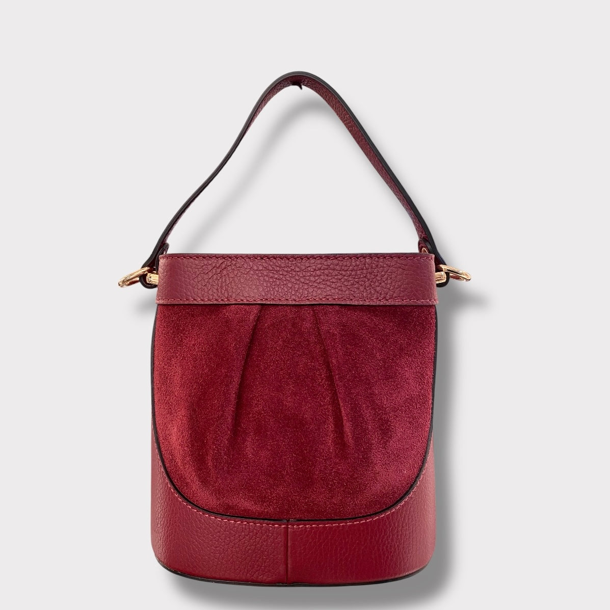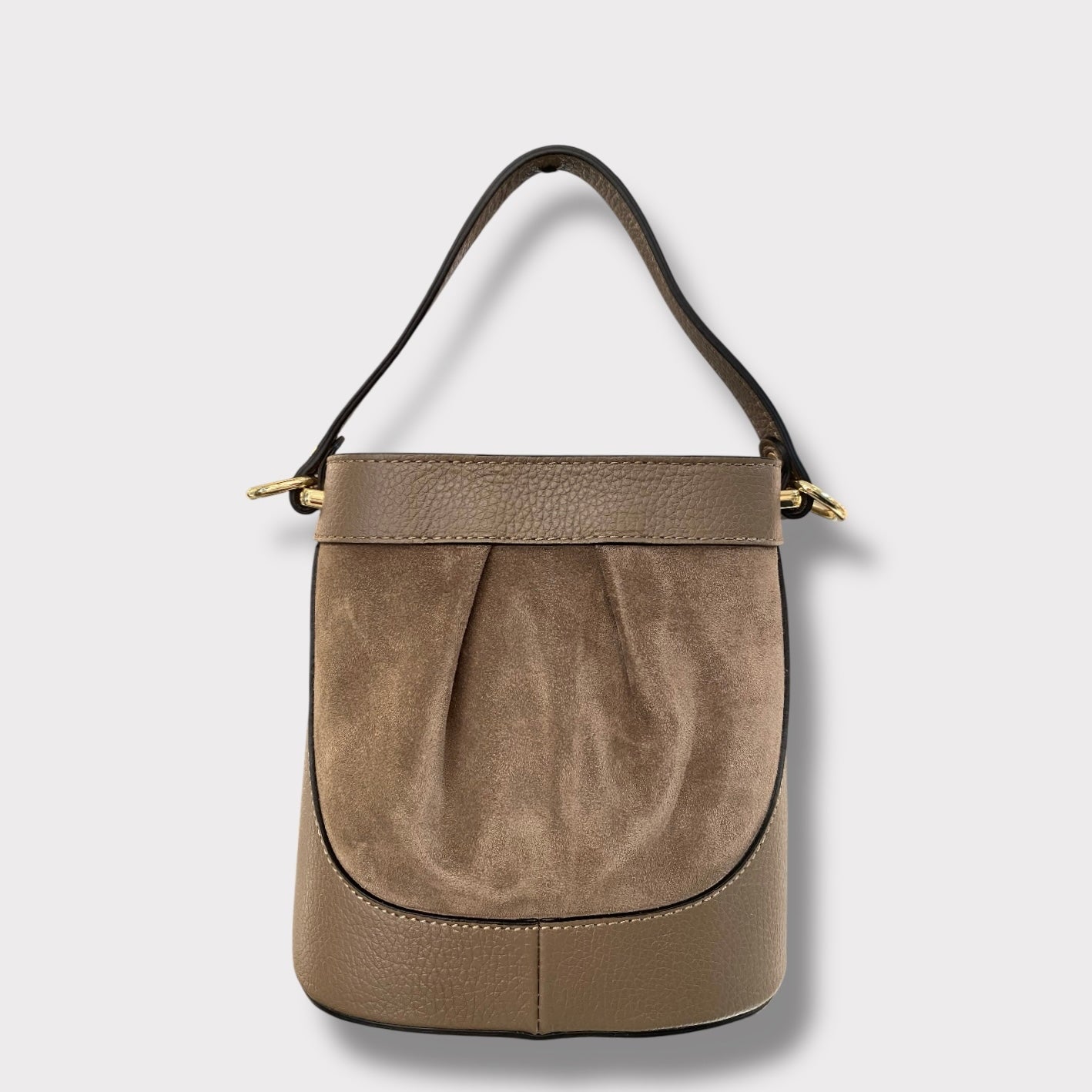 Borsetta di piccole dimensioni, realizzata in pelle scamosciata e pelle martellata.