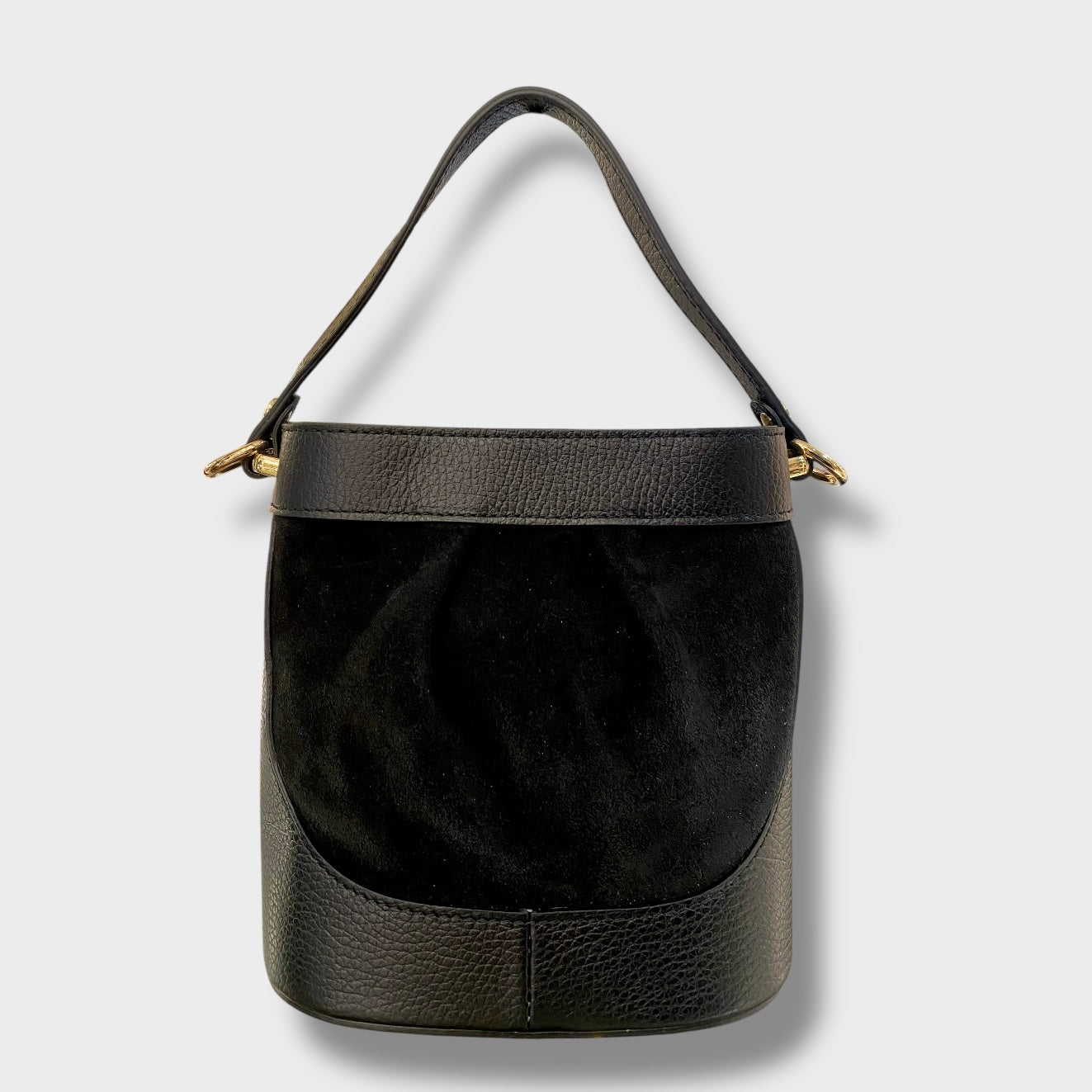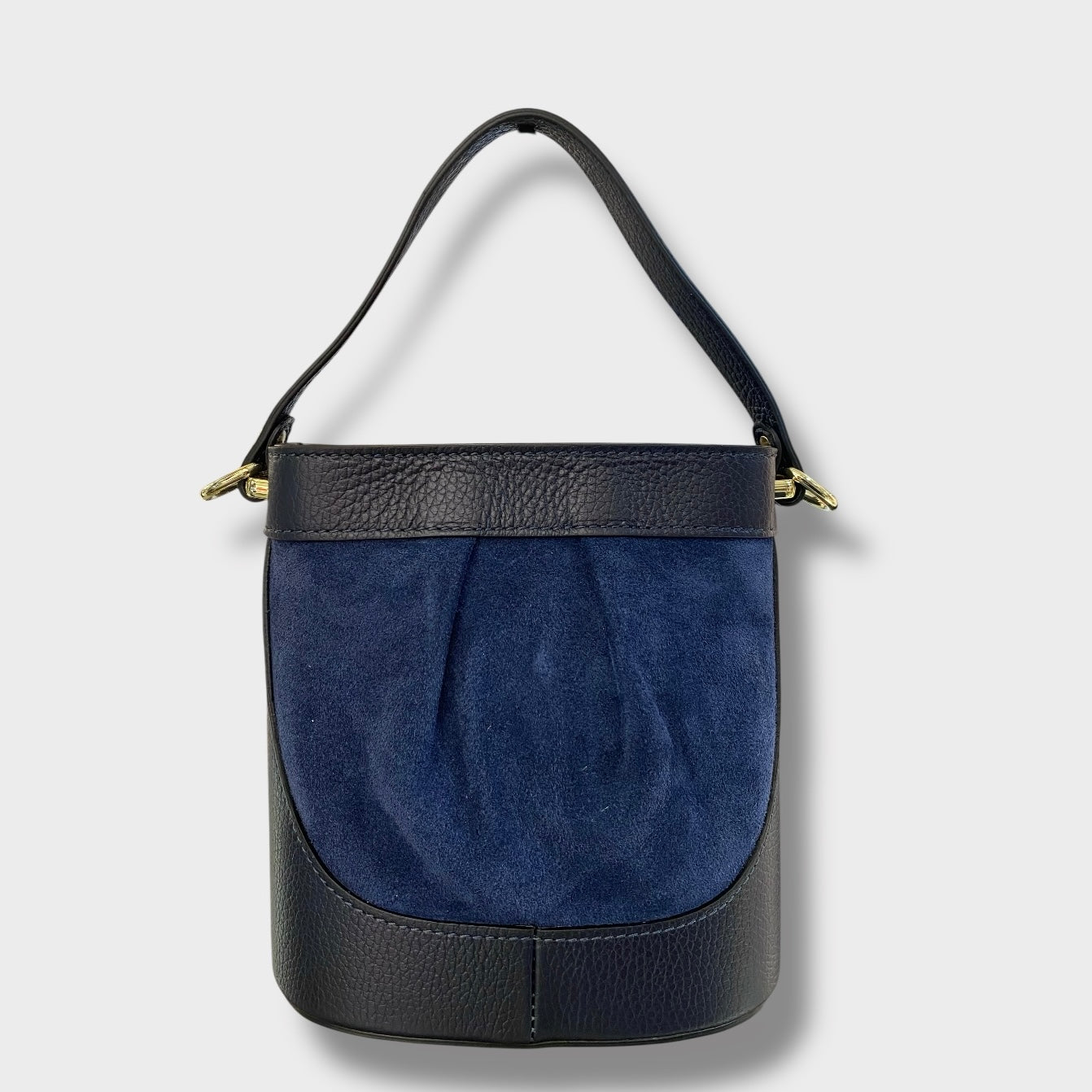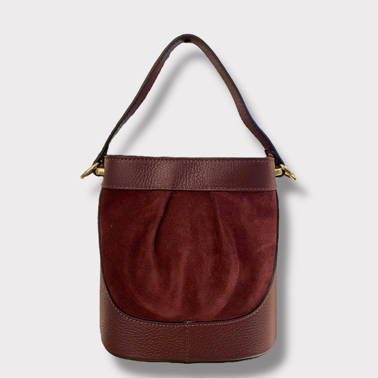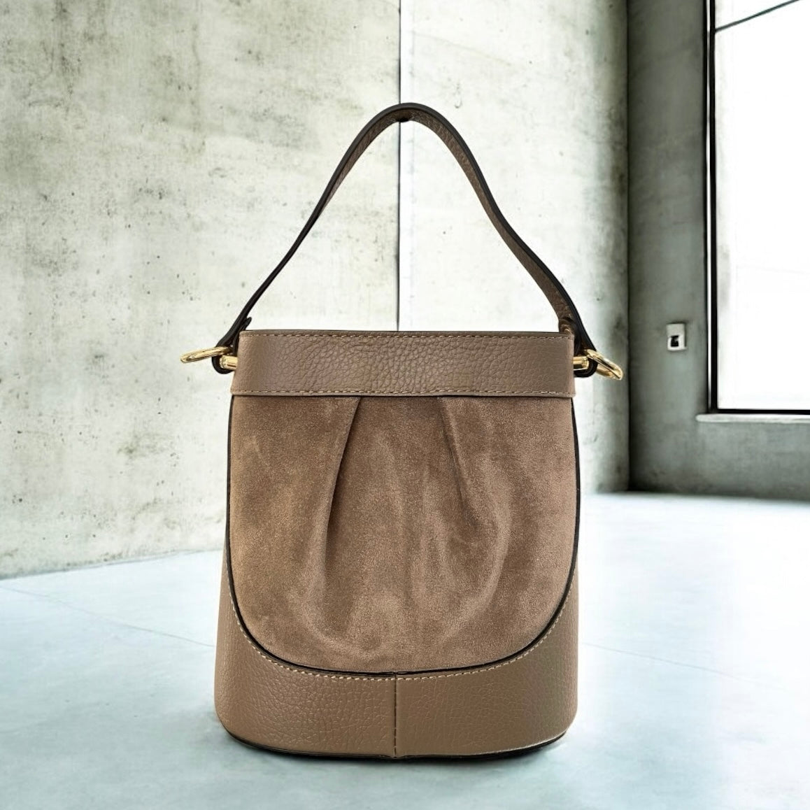 Borsetta di piccole dimensioni, realizzata in pelle scamosciata e pelle martellata.