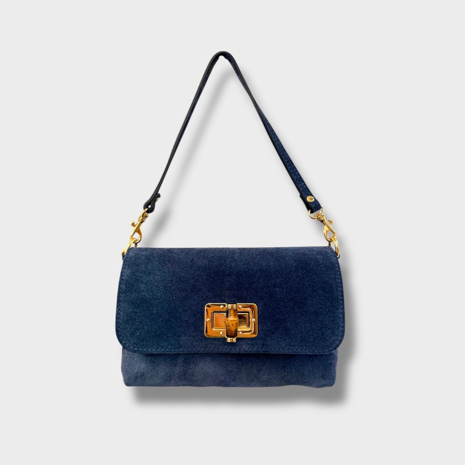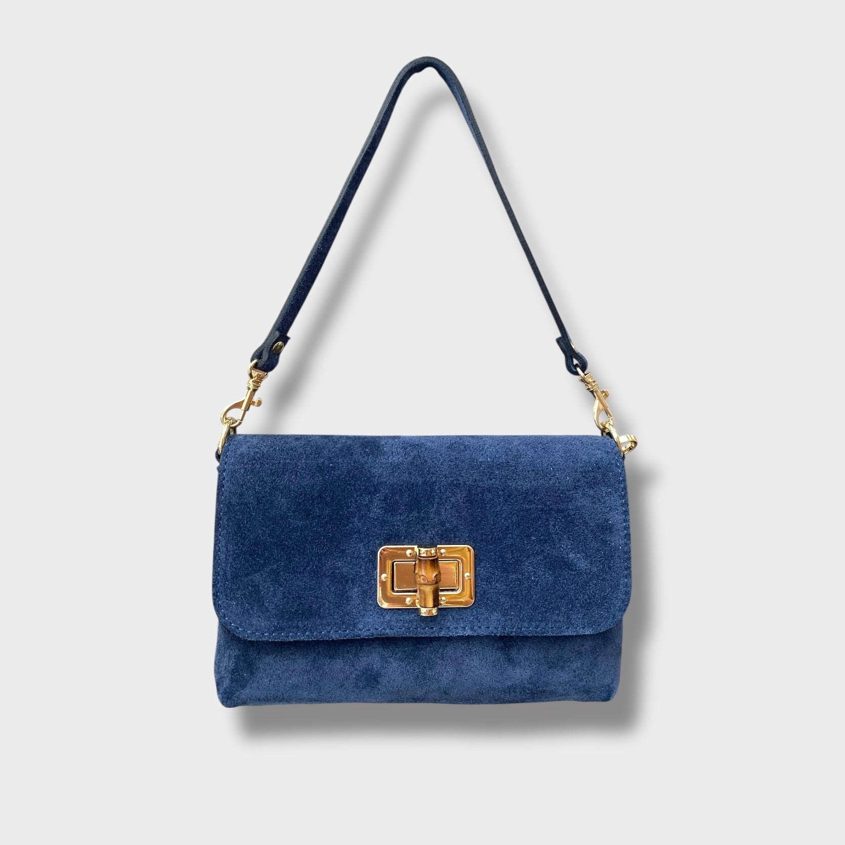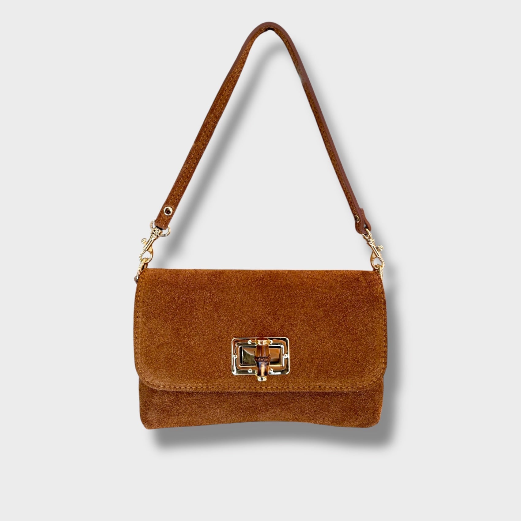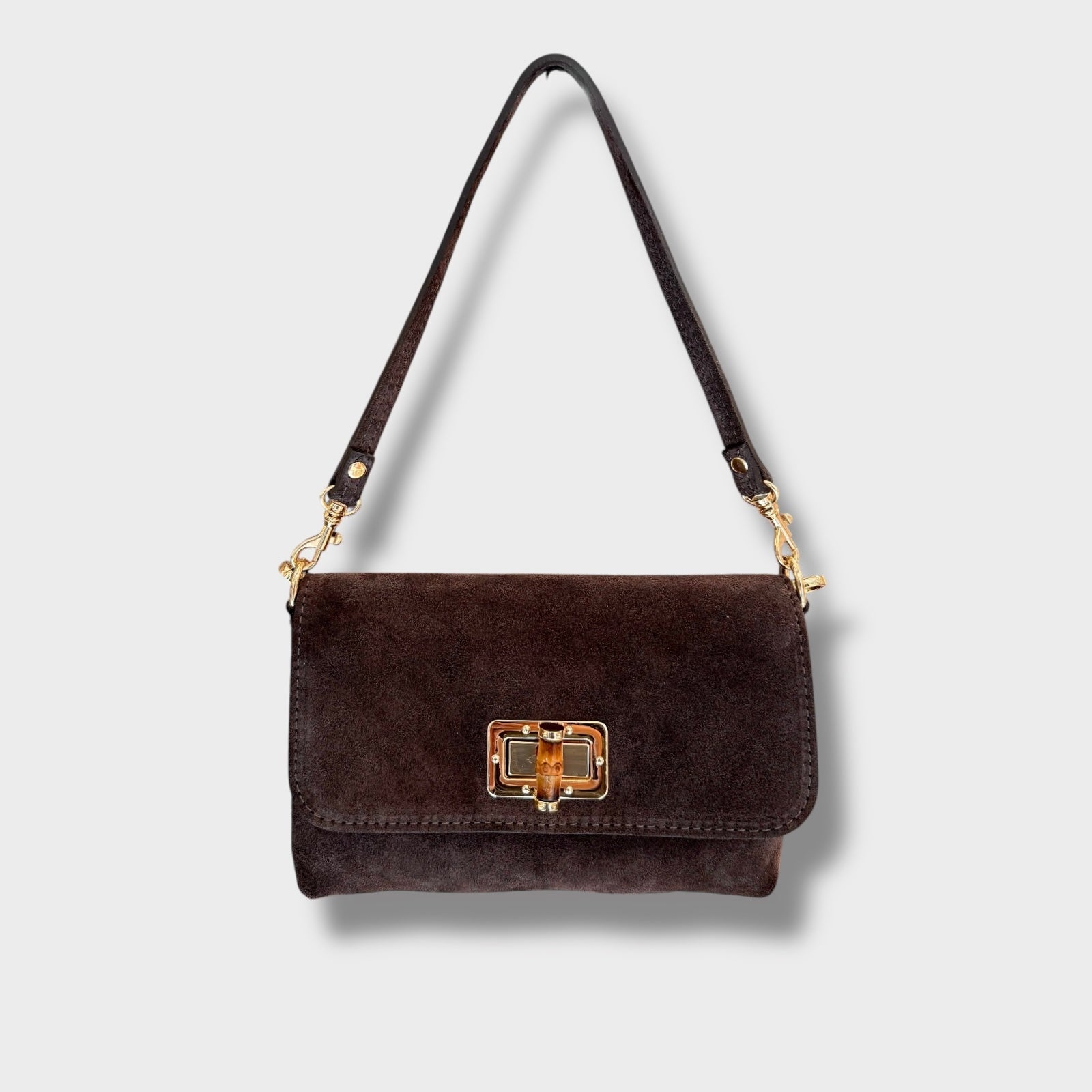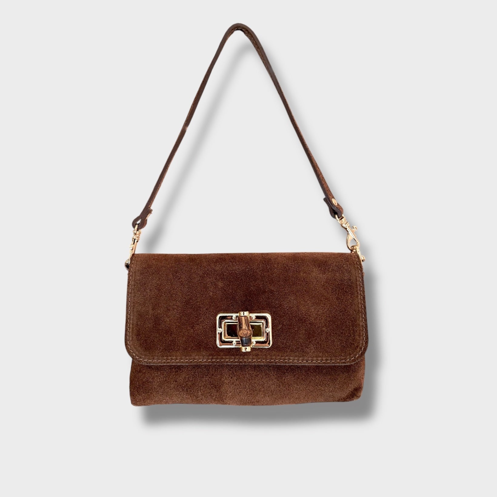 Piccola borsetta realizzata in pelle scamosciata. Chiusura in bambù.