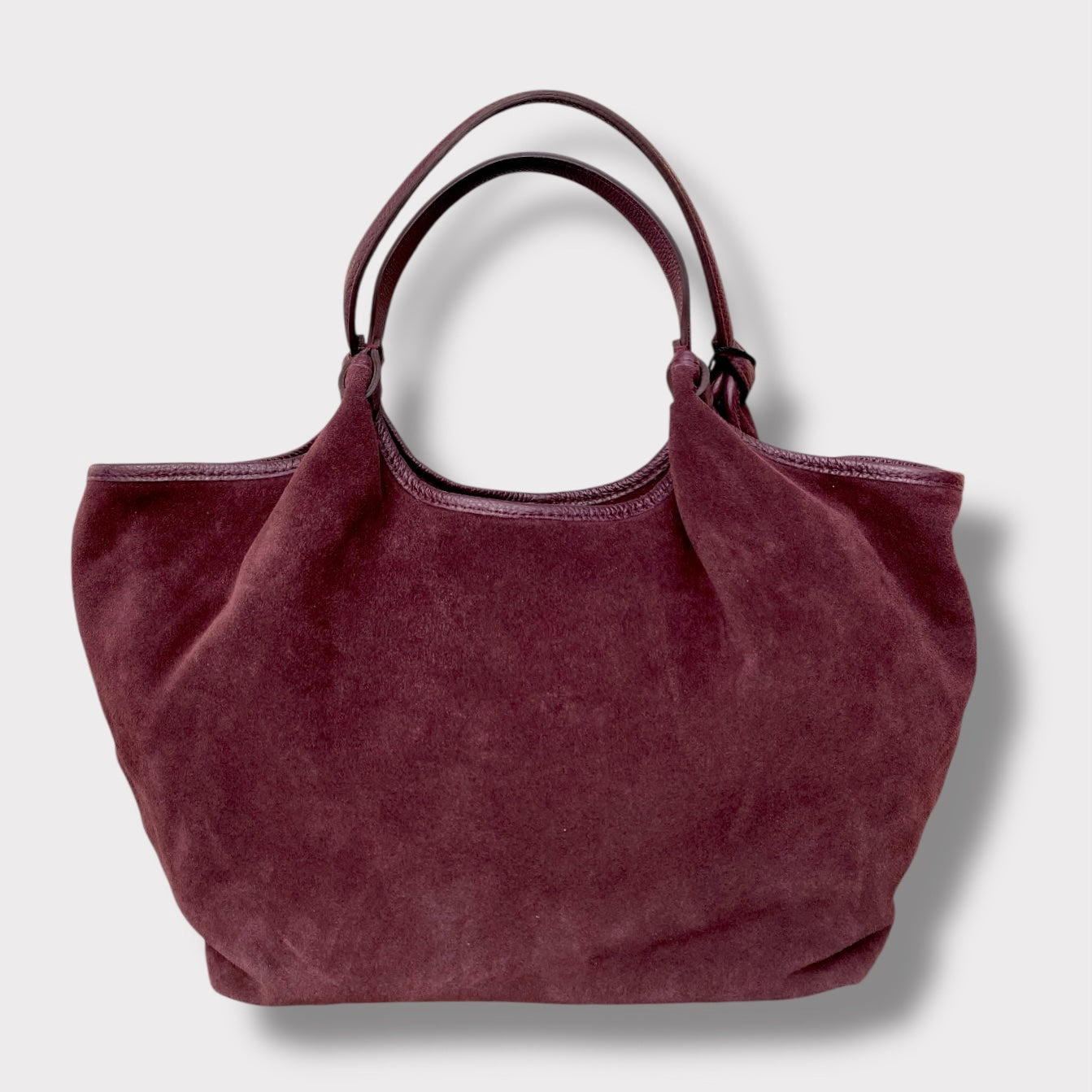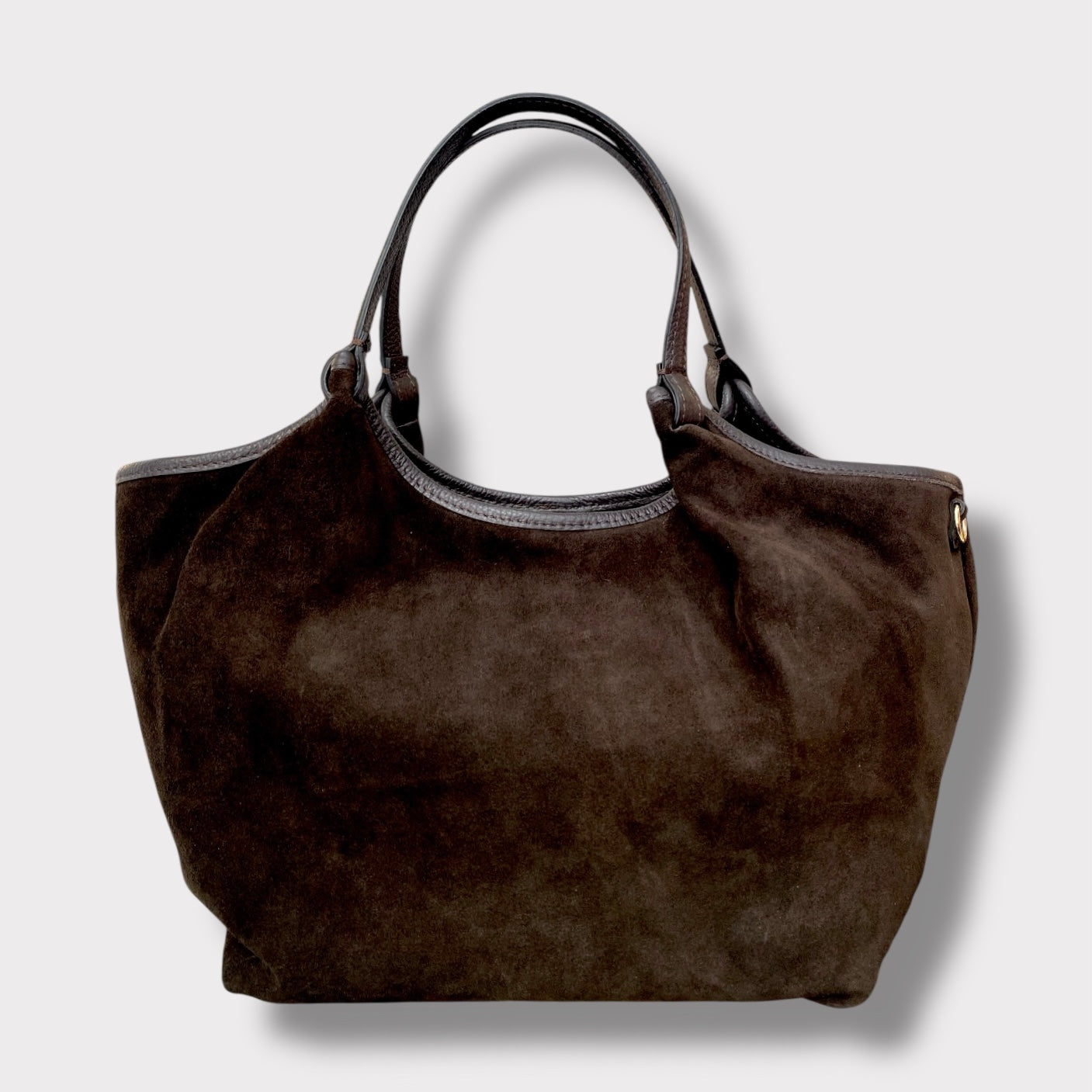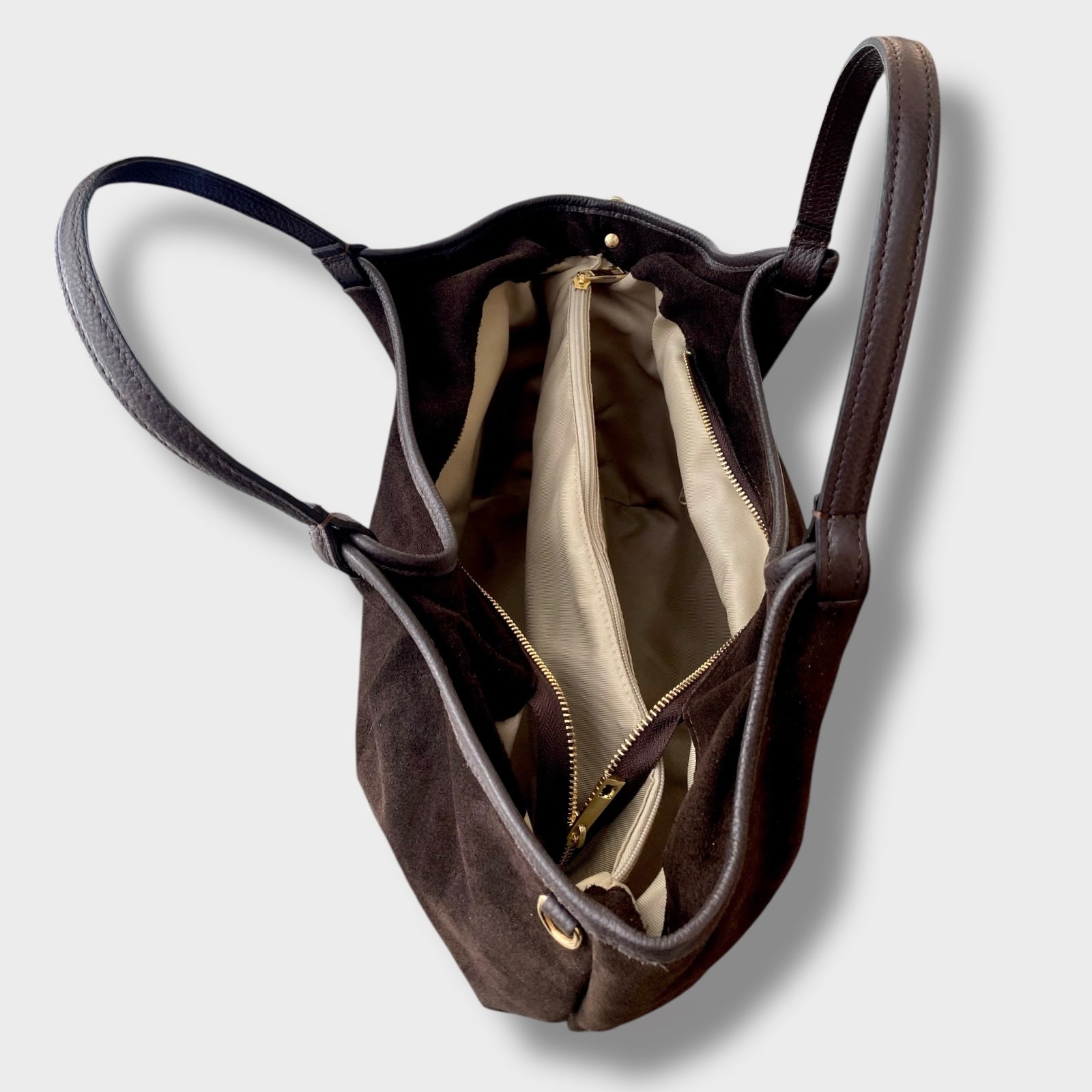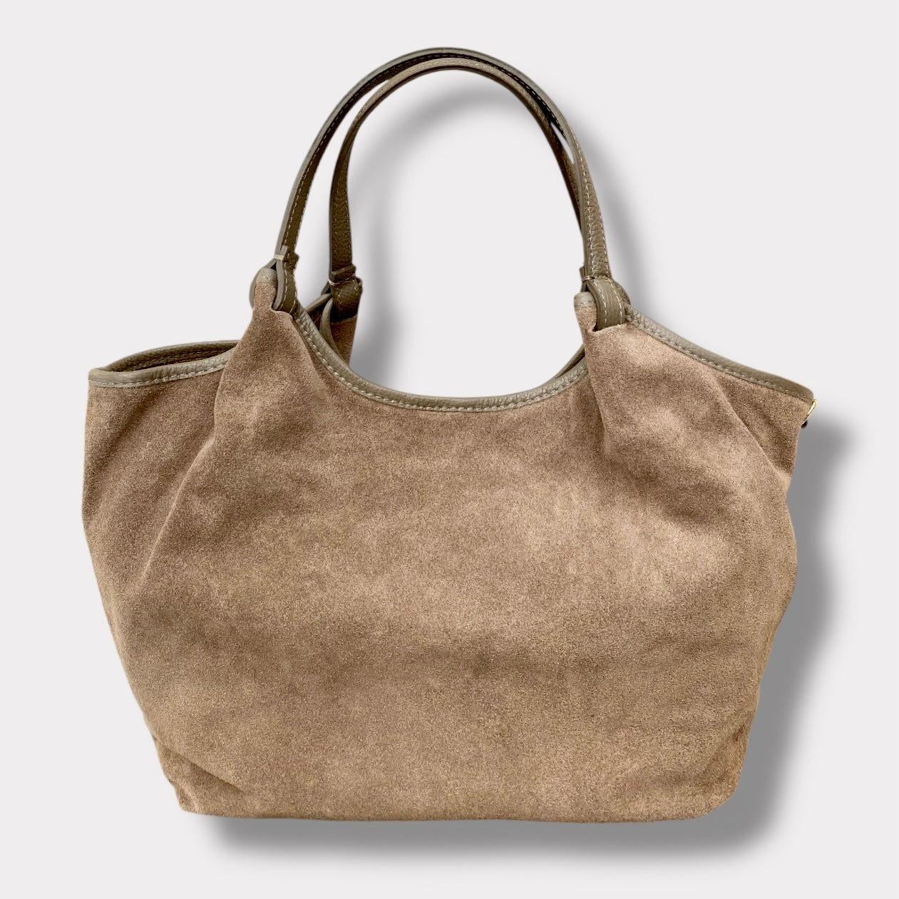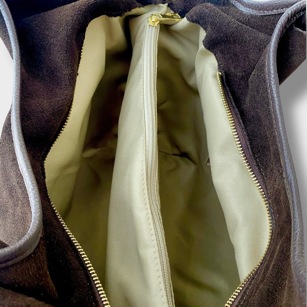 Borsa morbida di medio/grandi dimensioni, realizzata in pelle scamosciata e pelle martellata. Made in Italy.