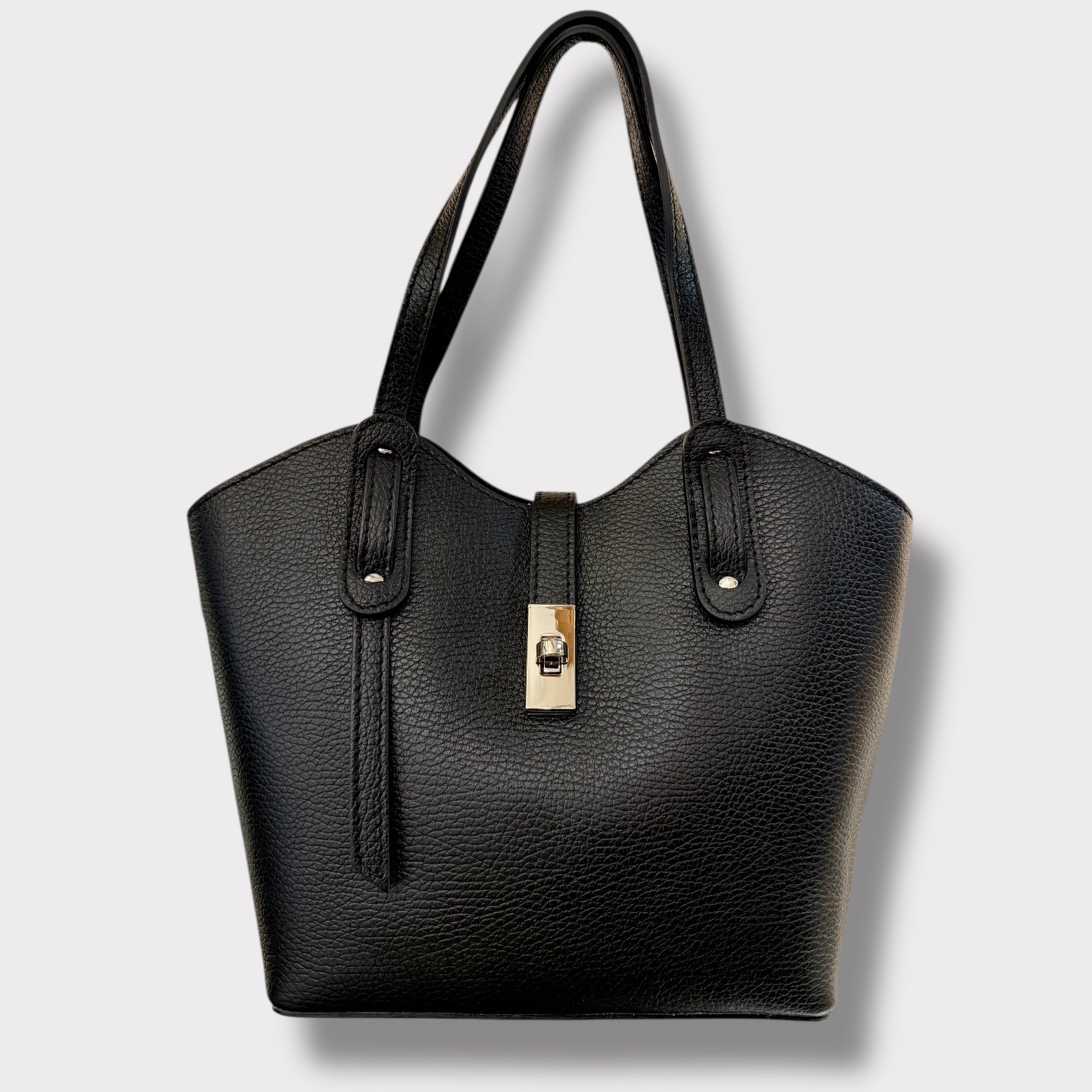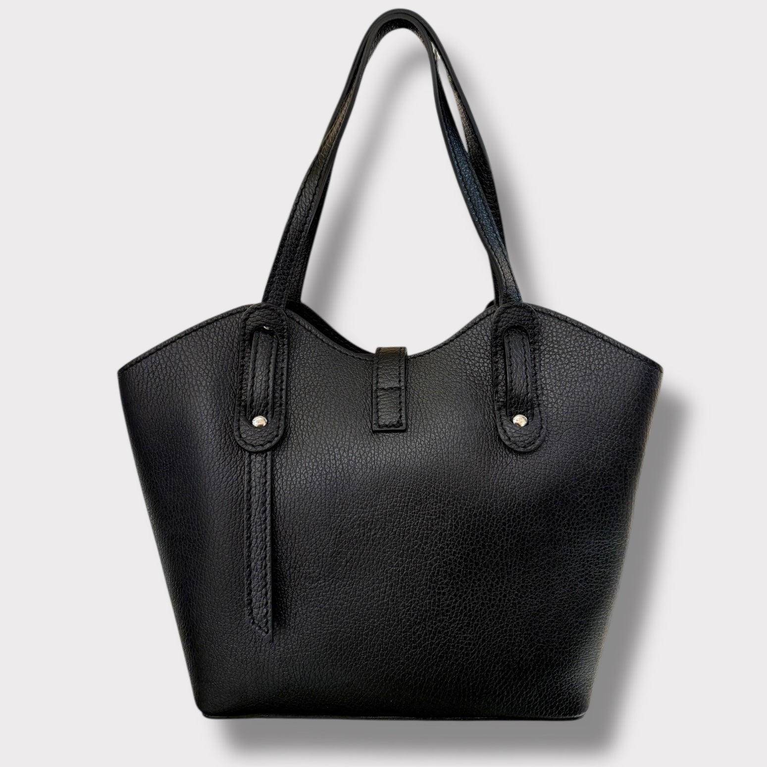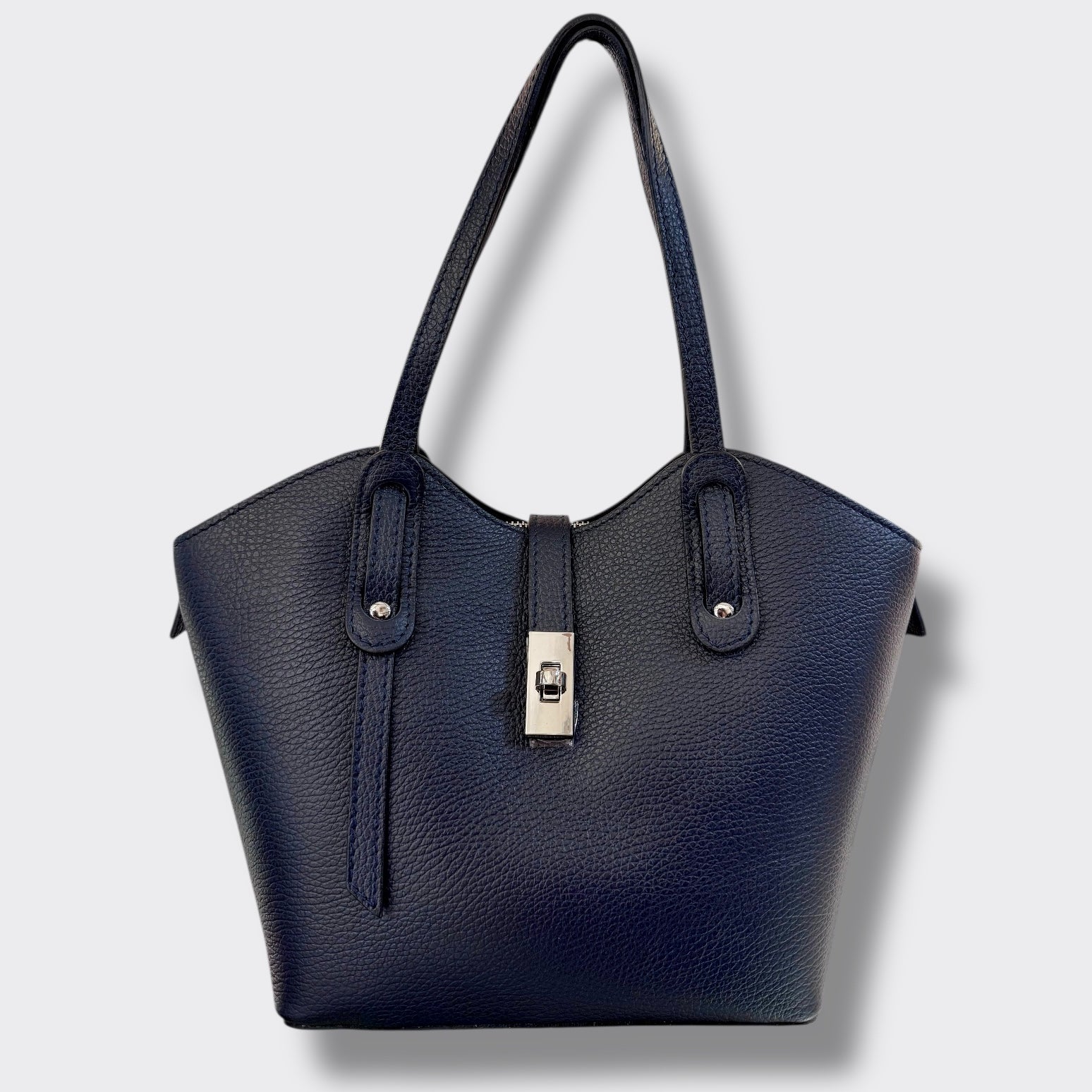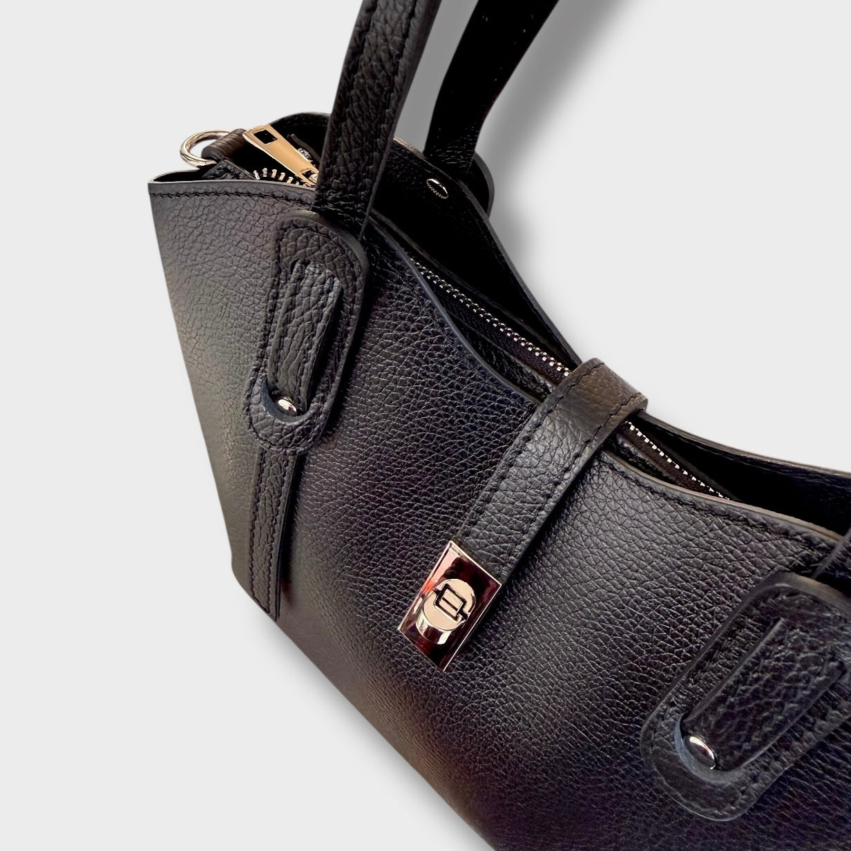 Si può portare a mano ed è completa di tracolla regolabile. Ha un doppia chiusura. Ci sono due spazi laterali e quello centrale e’ chiuso con zip. Al suo interno ha una taschina chiusa.