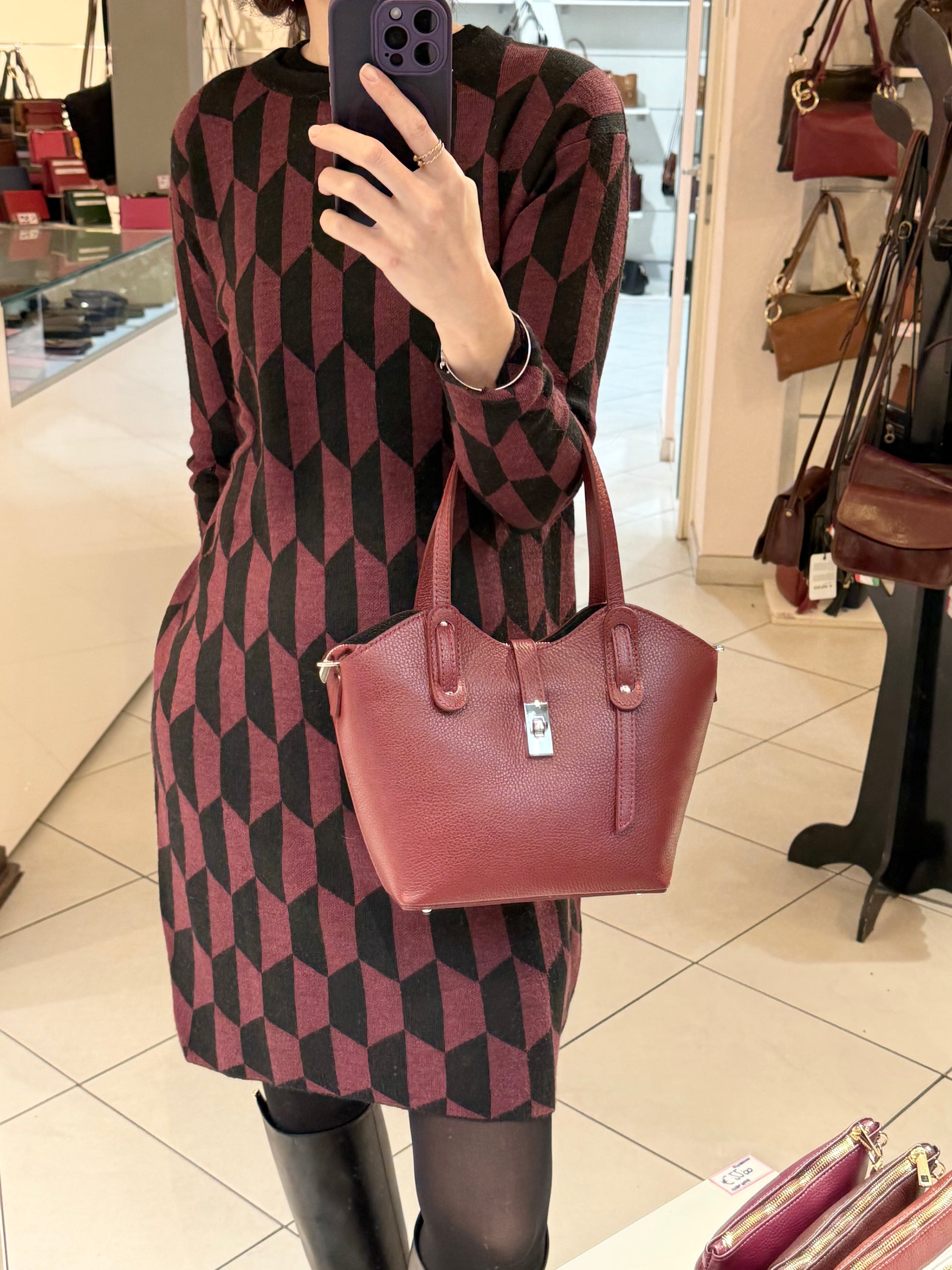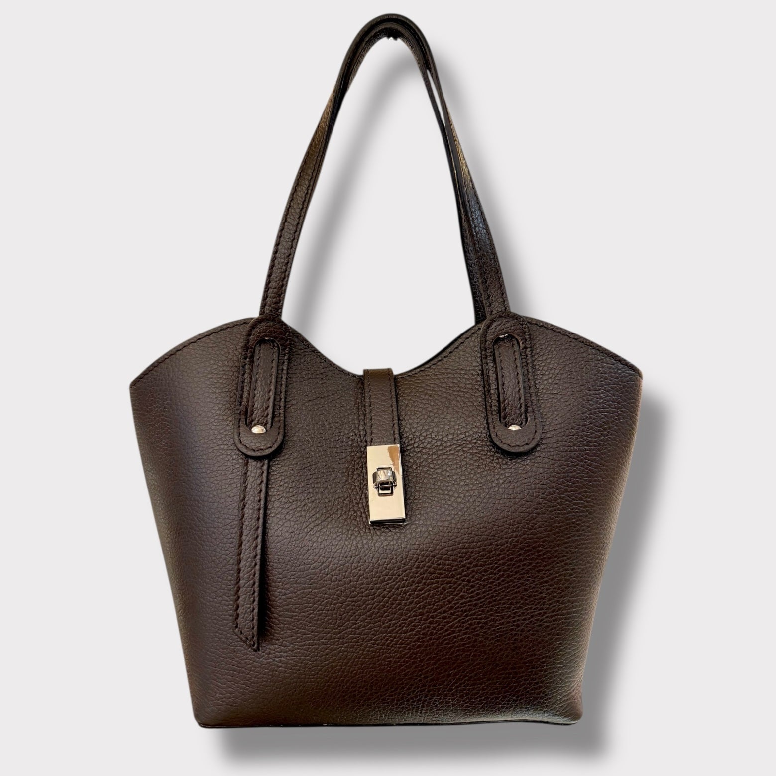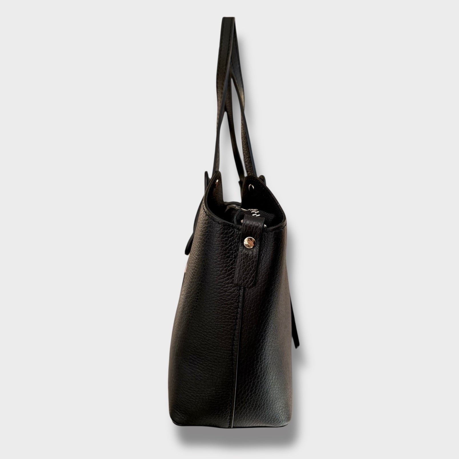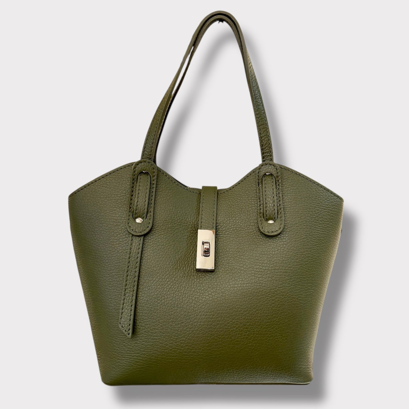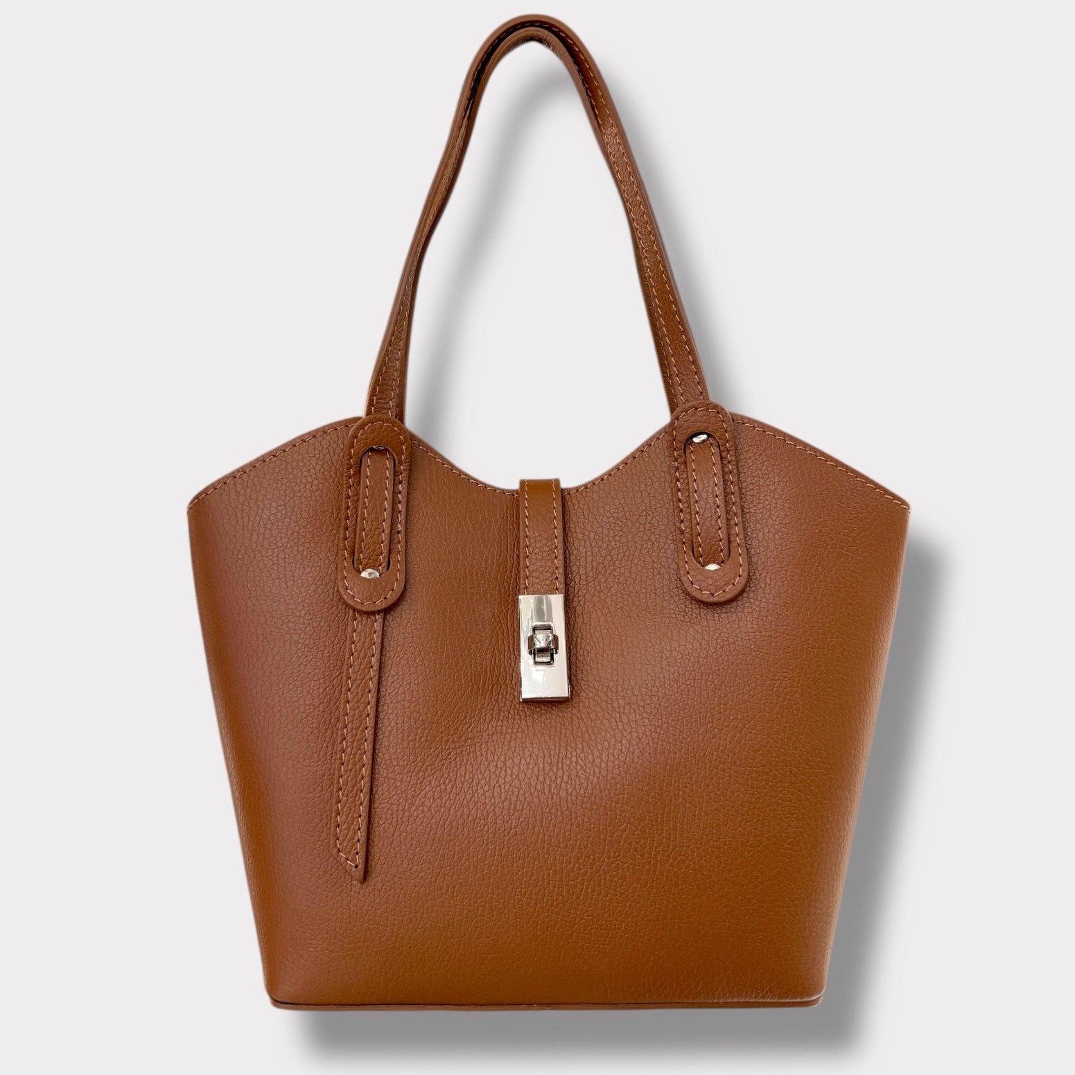 Si può portare a mano ed è completa di tracolla regolabile. Ha un doppia chiusura. Ci sono due spazi laterali e quello centrale e’ chiuso con zip. Al suo interno ha una taschina chiusa.